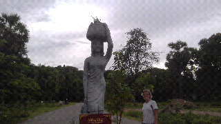 Our day out in Battambang, photos of day.We hired a tuk tuk and driver for the whole day, they are very good at getting us to do that here! Cambodia appears to be run by transport cartels and kickbacks & you just have to go with the flow. We are grabbed at a bus station, whizzed away to see the hotel of their choice and then that ride is free if you take them for the whole next day! But usually it is a win win, costs about $15 for the day. Our driver was Nat and he had a grin on his face all day, according to his friends he hadn't had work for a week... They usually sleep the night in their tuk tuk outside the hotel. First off, leisurely breakfast of fruit salad, yogurt, baguette, omlettes and coffee at a lovely cafe, then away in our tuk tuk to the bamboo train, this is how the locals got by when the roads fell apart and trains weren't working during the Khmer rouge days. When other bamboo trains come the other way both stop, one gets lifted off to let the other one past. It stopped at a village and we were shown around a brick making factory by some delightful local children, talked into buying a cold drink and another scarf & relieved of a few more $$! That took a couple of hours.Then onto some old ruins, kids walking beside us with fans as we climbed the steps, wanting a few more $, saw some big fruit bats, stopped to buy some 'pink' fruit, nice, a bit like a melon. Then to a little eating place for late lunch about 30 km away, another mate of the driver. We walked up to a temple, the highest hill around. It is also another killing field with lots more skulls and bones in the memorial inside the cave. Had an interesting chat with a monk, very friendly and well educated, also after a donation for his school... After we walked down we waited near a bat cave. Around sunset every night millions of little bats come out to feed. An amazing sight, just swarming out for over 2 hours, black streams in the sky. I asked our driver where they went and he replied, laughing heartily, they go to the night club!! Half hour drive back to the Royal hotel, $15 for deluxe suite, cable tv, aircon, WiFi etc and most importantly a comfy bed. Clean folded laundry returned. Time for a beer and spring rolls at the roof top restaurant watching the monsoon rain pelt down. A good day out. Boat to Siem Reap next.